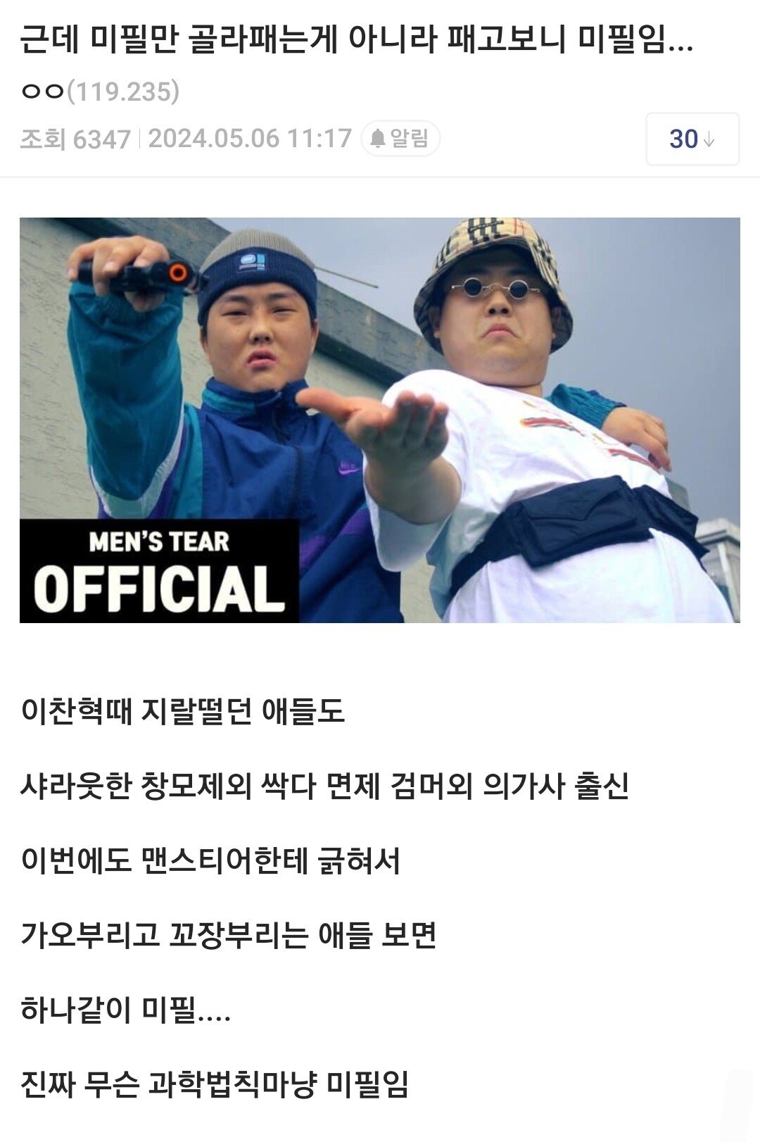 그렇게 전역후 영리활동 하면 안된다고 했는데 랩레슨ㅋㅋ 하면서 돈번것도 뽀록나고 걍 좀 많이 추했음 그때 | 25.03.01 21:39 | | |