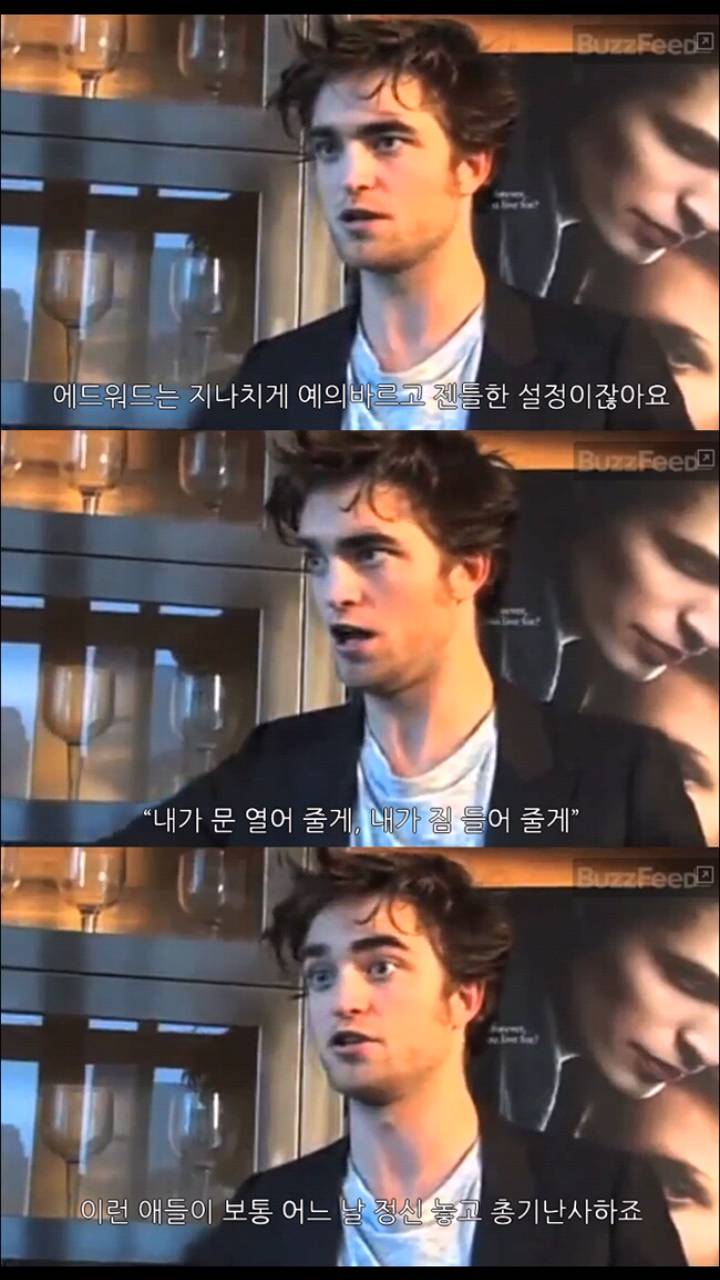 "그래요 처음 해리포터 조연은 괜찮았아요. 그런데 그 빌어먹을 뱀파이어 영화 남주로 나오면서 뭔가 틀어졌다고요. 시발 내가 이젠 저스틴 비버 포지션 배우로 대우받는다니까. 난 깊은 물에서 놀고 싶다고! 내가 길을 걸으면 여자들은 와 에드워드다 이러고 남자들은 키득거리는게 어떤 기분인줄 알아?!"