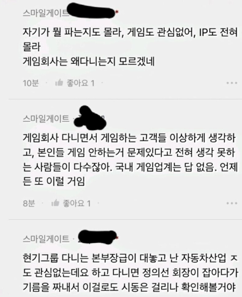 게임 회사 오래 다니면서 진짜 신기한게 '난 게임 관심 없어' 그런 헤드들 많이 봤다는 거임. 그렇게 잘난 분들이 왜 관심도 없는 회사를 다니시는 건지.. | 25.03.02 11:43 | | |