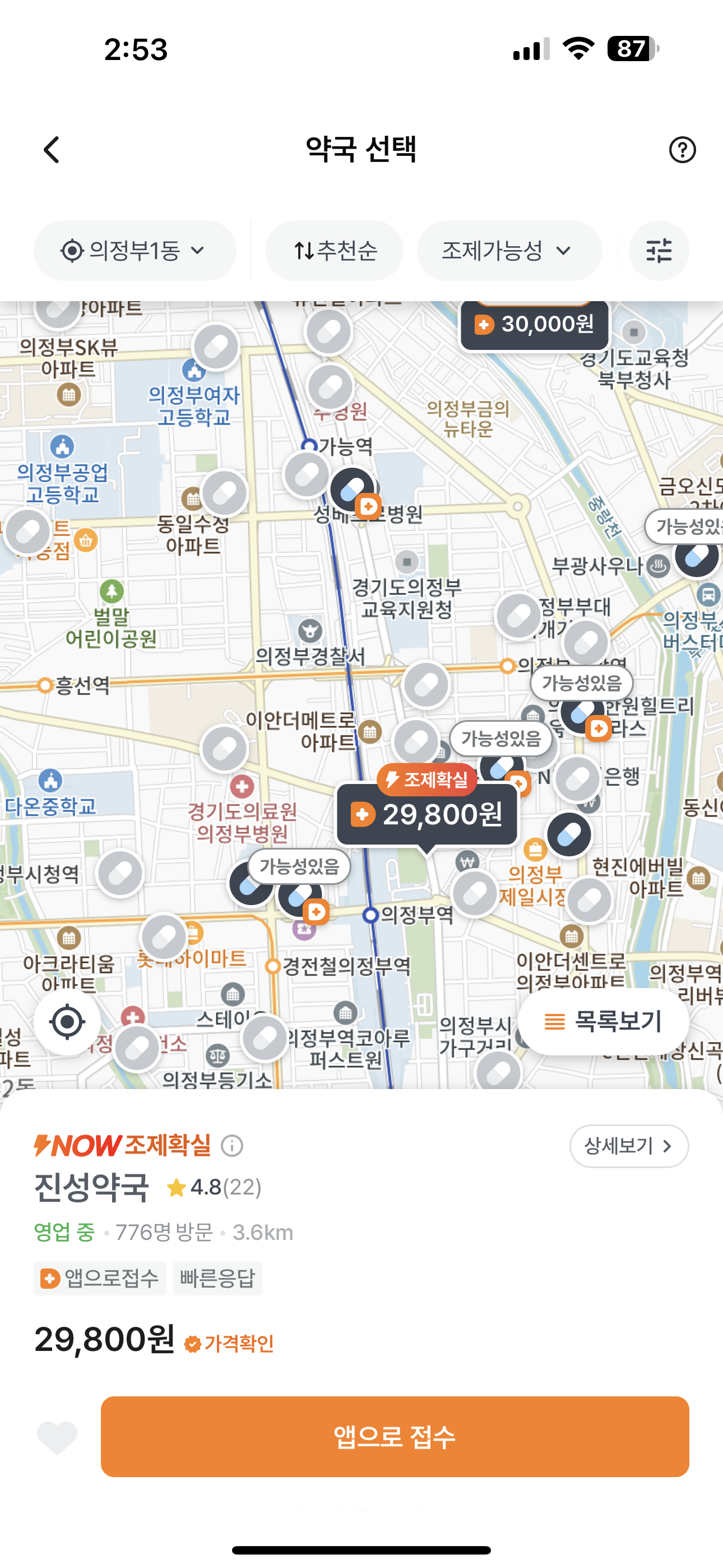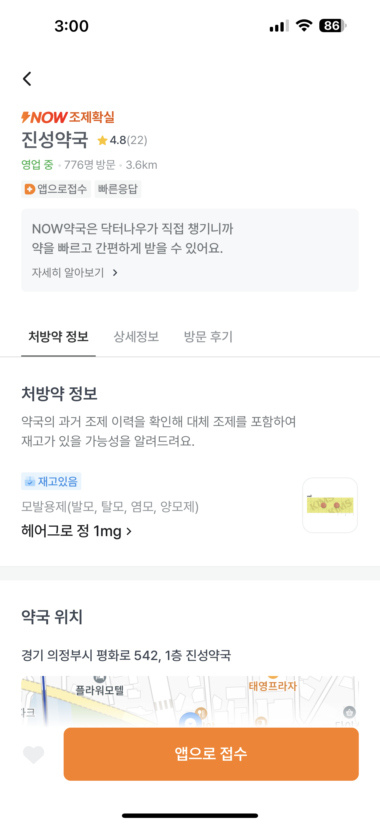 누르면 본인 주변 지도 뜨면서 조제 약국들 뜸. 확실히 조제하는지, 가격이 얼만지도 표시됨.
