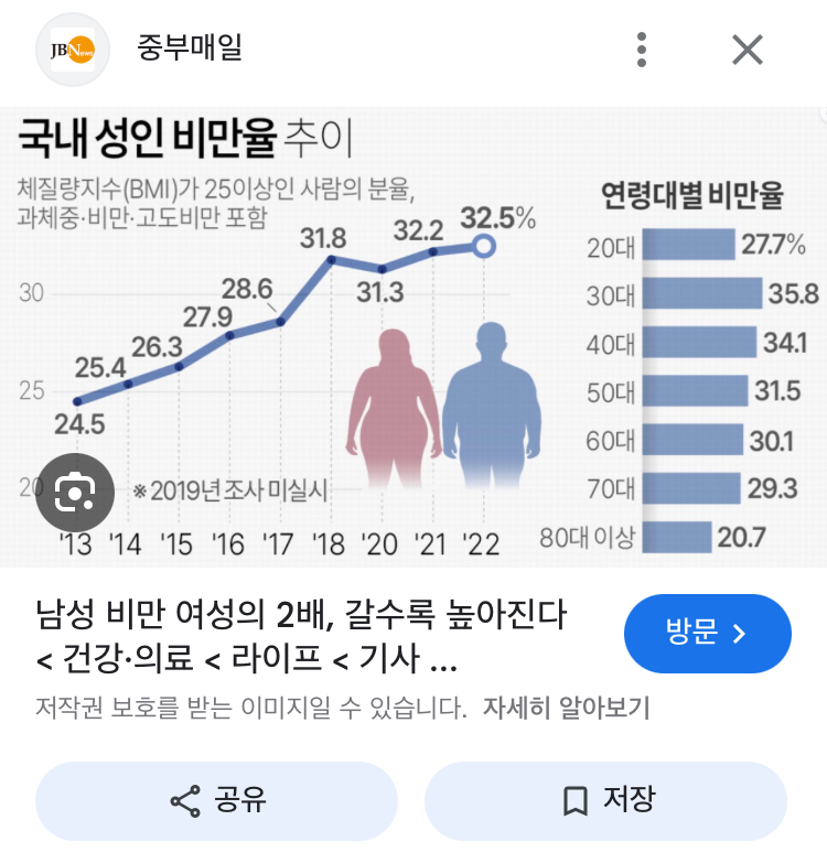 여성 비만율은 그렇게 않오름, 검색만 해봐도 16년에서 21년 동안 0.6% 오른 정도임 | 25.03.02 19:36 | | |