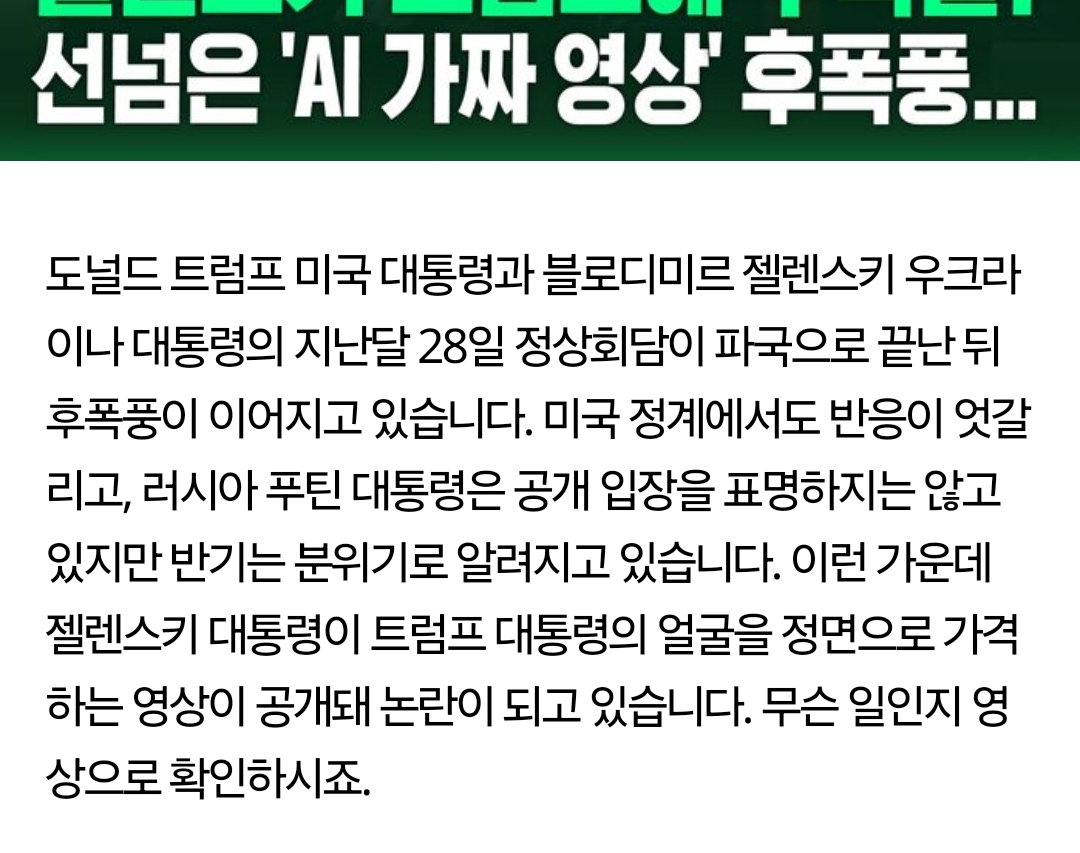 제목낚시고 본문은 저게 조롱으로 나온 딥페이크 영상이라고 언급할거임 | 25.03.02 19:56 | | |