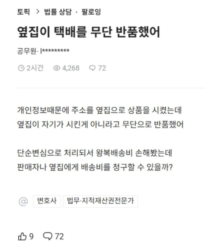 경비실이 문제가 아니라...일단 우리집으로 온거 내가 받아서 주소지는 우리집인데 우리집에 거주하지 않는 처음보는 사람이 받는 이로 되어 있어서 연락해서 반품시킨적 있다고... | 25.03.02 20:39 | | |