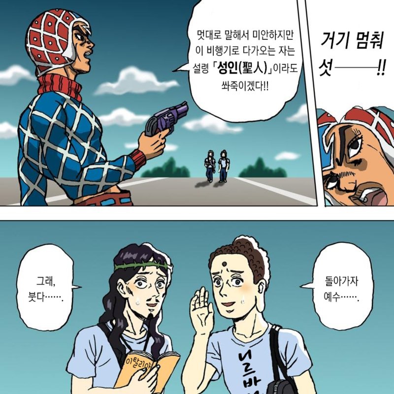 "애초에 여기 활주로인데..." "쉿 예수! 마피아일지도 몰라!" "그러면 더 그냥 지나갈 수 없지..." "아앗! 예수! 이 타이밍에는 유다마저 포용한 그 자비는 넣어둬!"