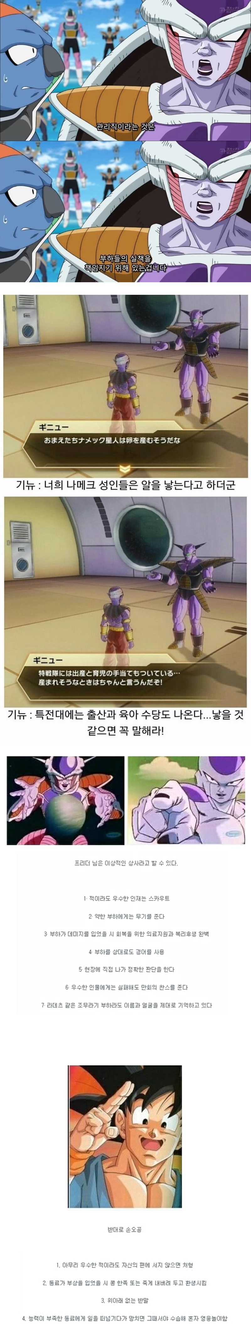 원래 프리더의 '사장으로서'의 모습은 본편에선 자세히 묘사되진 않았었슴. 그냥 마치 거대한 우주 조폭의 오야봉같이 나왔었지. 조직?이래봤자 우주선이 나메크성에서 금새 박살나고, 좌우 부관과 기뉴특전대 정도가 왔다가 차례차례 가고... 근데 슈퍼 시리즈가 시작하면서 프리더의 '조직(회사)경영?'이 자꾸 나오게 되면서, 과거 본작에서의 모습도 재조명되고... 그렇게 '좋은 사장님 프리더' 밈이 시작됨 ㅋㅋㅋㅋㅋ
