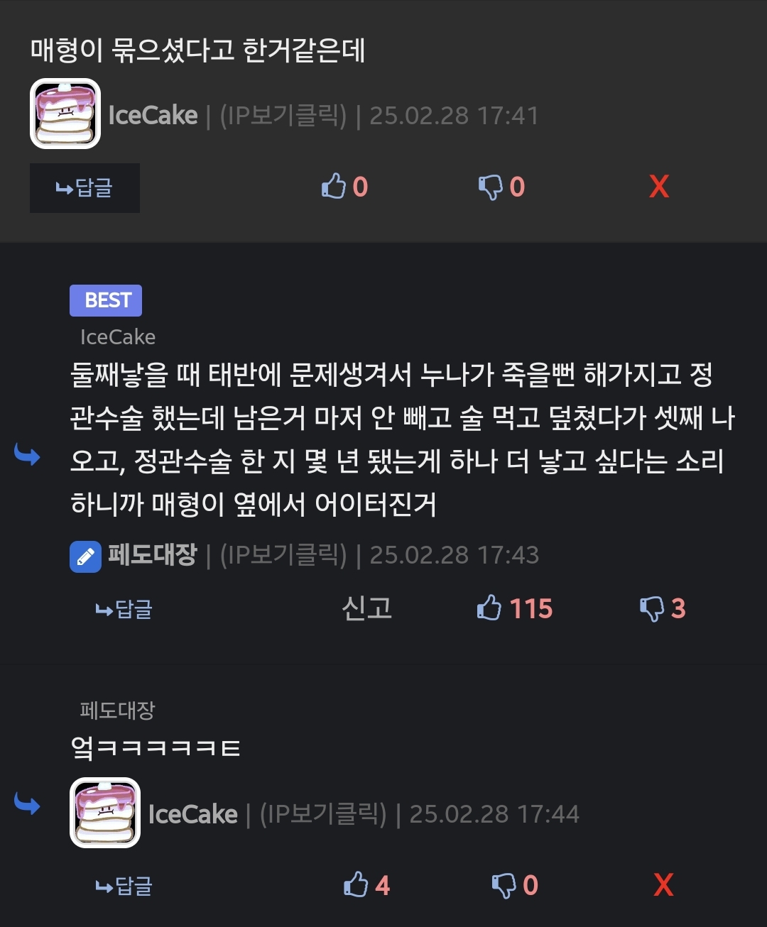 그 둘째 출산하시다가 큰일 날뻔하고 묶은다음에 다 안빠진상태에서 술먹고 셋째만드신거래 | 25.03.03 16:53 | | |