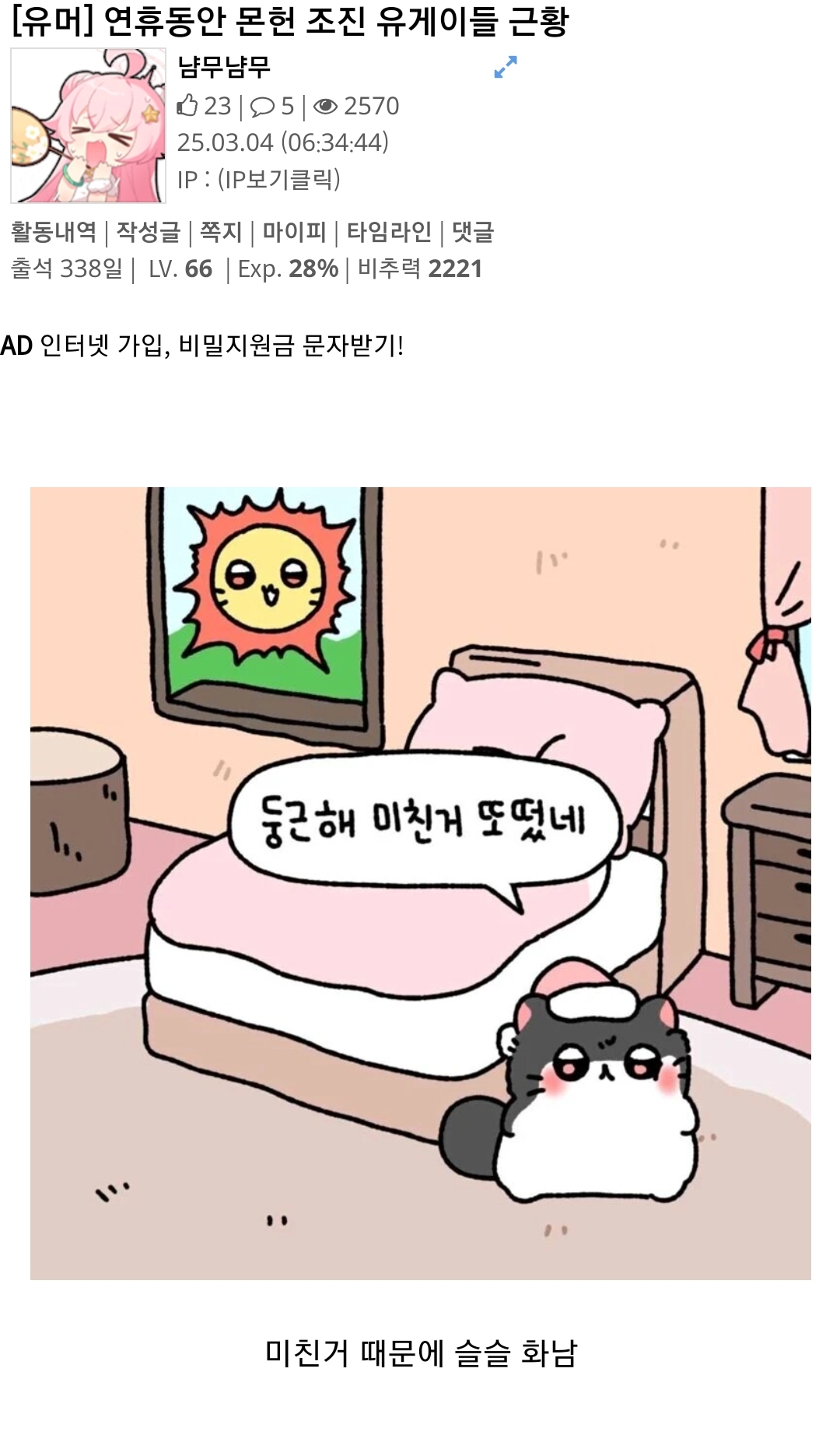 저분은 재업해가면서 안되니까 구걸까지해서 가는걸로 까셨는데 그러는 분이 지는 베스트 보낸거 재탕하면서 보내면서 남한테 시비거는거는 합리화시킬려고 저러시나봐요 | 25.03.04 08:38 | | |