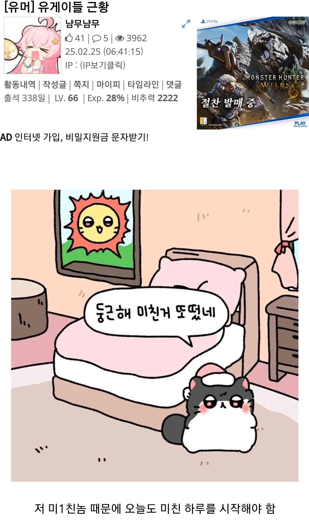 아 글쿤여... 등신짓 해서 등신짓 말라고 애둘러서 댓글 한번 달았더니 갑자기 혼자 풀발하셔서는 몇달내내 관음하면서 개소리 찍찍 하시던 분이 너나나 하면서 끌어들이려고 하니 기분 좀 묘하네요; 뭐 어떻게든 나는착해 나는옳아 하면서 합리화 하려고 애쓰시는 분이니 그냥 그렇다고 하시죠ㅋㅋ | 25.03.04 07:48 | | |