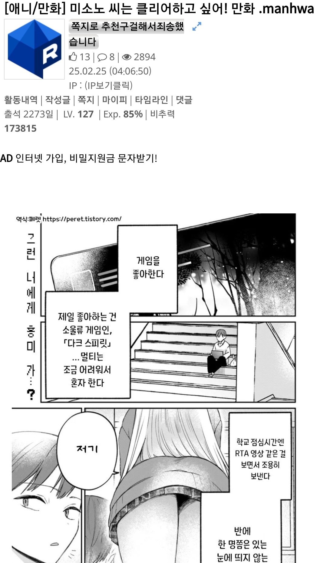 님이 지금 말하는 주제가 재업해서 안가니까 구걸글써서 간걸로 까고 있잖아요 다른 글에서도 똑같은 주제로 깠으면서 뭐가 아니다마래 라고 말하시나 사람 험담하면서 까내리는 행동 앵간치하세요 님 말만따라 비추쌓여서 글삭하고 감정호소하고 다녔으면 그런글들 다 지우고 제가 이러는거 겠네요?? 여론은 그리고 님이 시비걸다가 역으로 쳐맞으니까 감정호소 하시는걸로 보이는데 비추받는것도 이유가 있거나 그냥 받는거 둘중하나인데 받는것도 쪽지로 추천구걸하니까 받는건데 지 혼자 헛다리짚고 난리시네 | 25.03.04 08:03 | | |