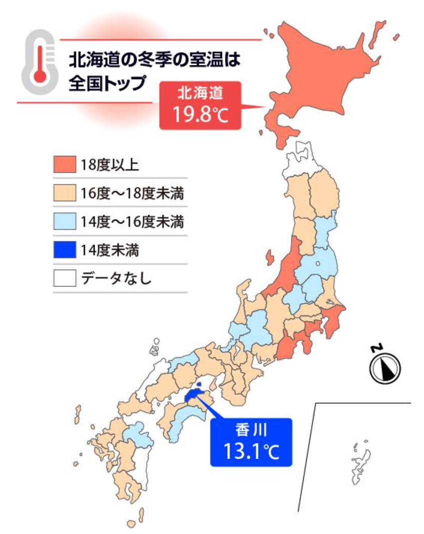 북해도를 비롯해서 전국적으로 겨울이라도 16~18도 유지하는곳이 더 많고 북해도 같은경우에는 겨울철 실내 온도가 20도 정도가 평균임 걍 우리나라처럼 보일러가 아닐뿐 북해도 사람들은 겨울에도 반팔입고 아이스크림 먹는대 라는 말이 있을정도로 난방하는 곳은 함