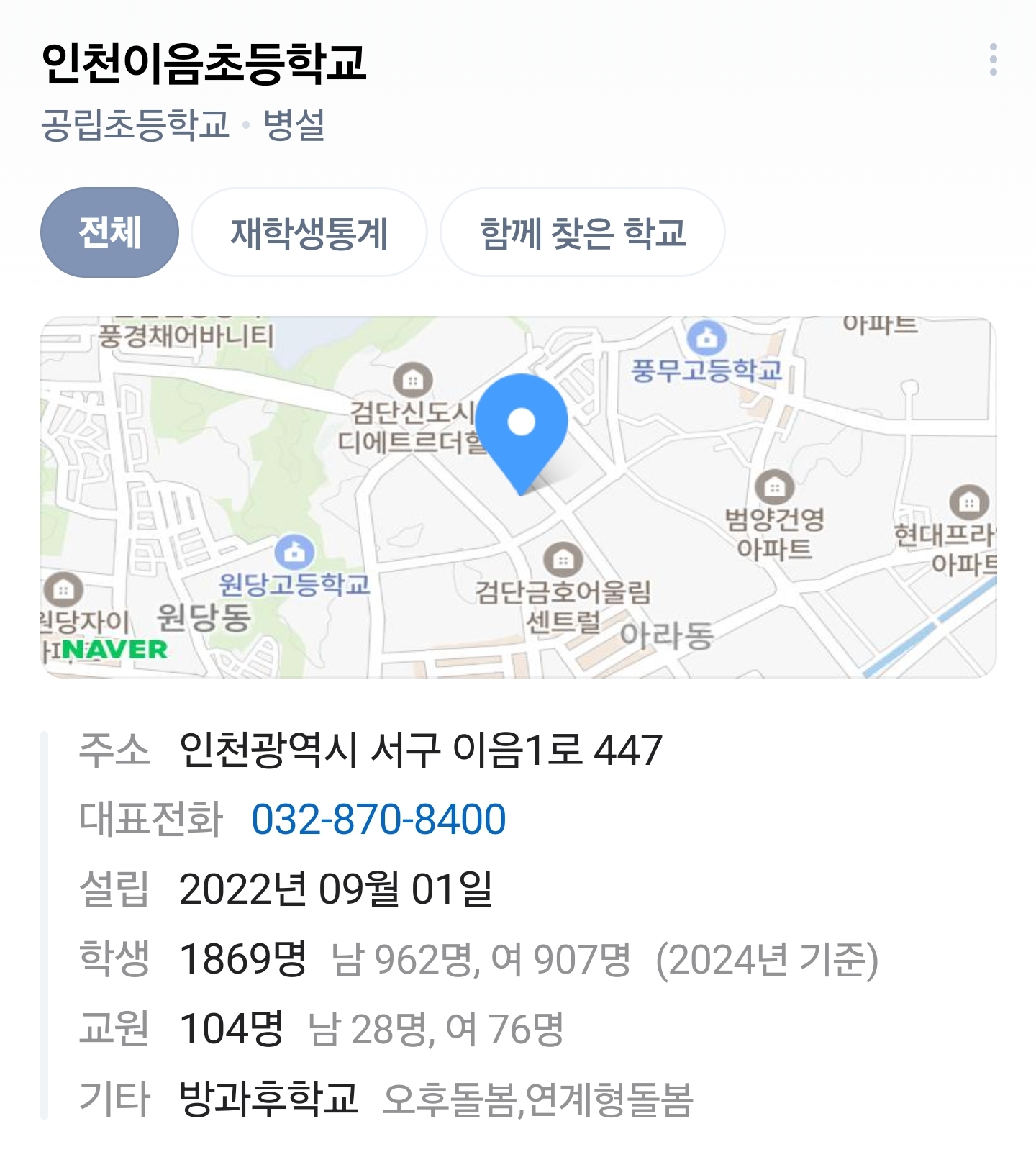 물론 반대로 미어터지는 학교도 있음. 인천 검단신도시 중앙에 위치한 이음초등학교. 인근 초등학교들 대비 가장 학생수가 많은 학교임. 인근에 1600명대 초등학교도 있음.