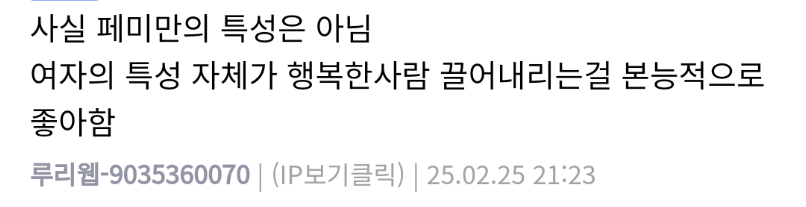 여자가 싫은 건지 여초가 싫은 건지 페미가 싫은 건지는 니 알아서 살든말든 알 바는 아닌데 말을 좀 이쁘게 하라고 | 25.03.05 04:10 | | |