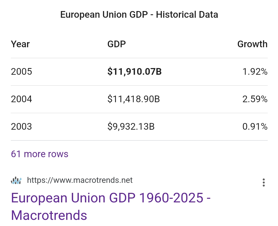 한국에서도 2004년 회원국 확대로 미국하고 같은 수준이 된다 이런 이야기가 나왔었음. 미국보다 말 그대로 살짝 큰정도였으니. | 25.03.05 12:45 | | |