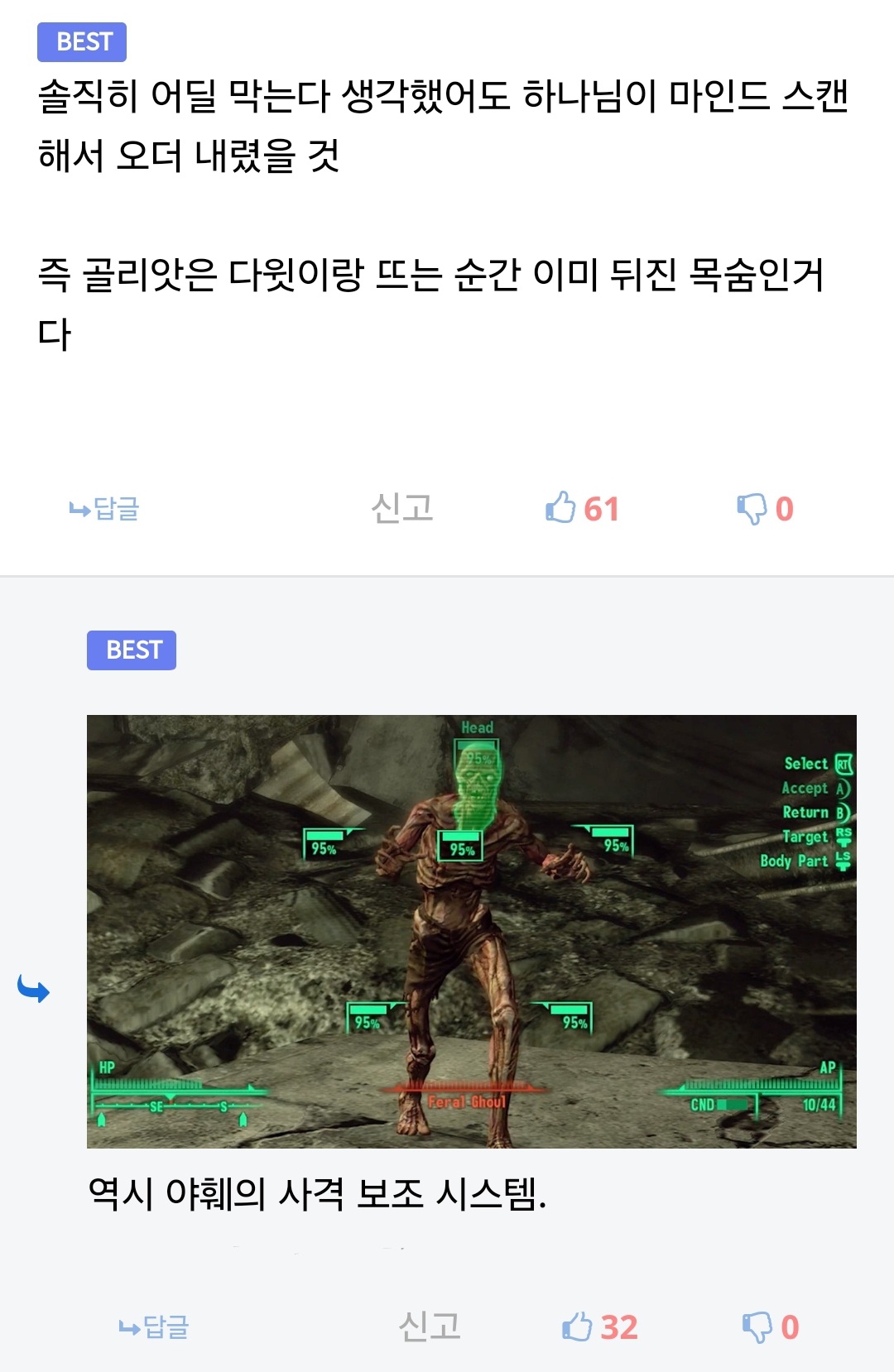 그래도 VATS라 다행이네 X-COM시스템이였으면 ㅋㅋㅋㅋ | 25.03.05 22:36 | | |