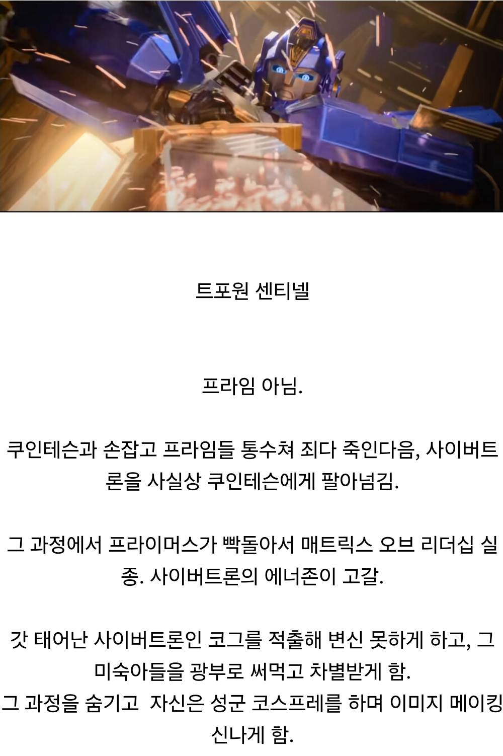 미숙아들 광부 써먹기=아동노동 합법화 쿠인데슨에게 충성=푸틴에게 충성 성군 코스프레 동일 아무리 생각해도 지금 하는짓이 센티넬과 너무 비슷해서 미국팬들중 일부는 노린거 아니냐는 말도 나옴 | 25.03.06 16:22 | | |