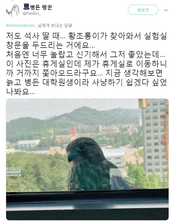 그정도면 자기 자신 생존본능이 급했나보다 ㅋㅋㅋㅋ 여러모로 도시화에 성공한 맹금류같음 | 25.03.07 19:07 | | |