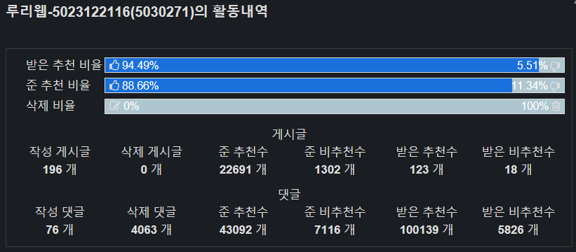 그걸 pc라는 이름으로 퍼지니까 pc를 이렇게 사람들이 싫어한다는거 알려줘도 뭐라 그러시네 ㅋㅋㅋ 페미처럼 pc 본인들이 손절을 안 하니까 같은 취급 받는거지 뭐 틀린 말이라도 했나? 그리고 활동내역은 뭐 ㅋㅋㅋ 삭제비율보고 발기한거 같은데 내가 삭제한게 아니라서 오류로 저런데 어쩔 ㅋㅋ | 25.03.07 22:19 | | |