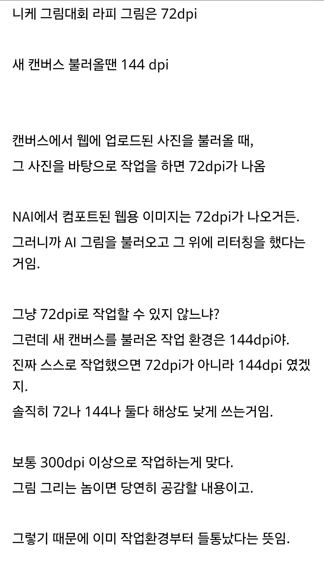 저 사람은 워낙 의심가는 부분이 많아서 옹호할 생각 따윈 없지만, DPI 만으로 이야기하는 건 조금 조심해야 한다고 생각해 내가 지금 작업중인 그림 정보값 열어보니 나온건데 DPI가 132 (프로크리에이트 생성 디폴트 값 중에 하나 골라서 그린 거) 누가 나더러 DPI 낮다고 트레이싱이나 AI 라고 말한다면 당황스러울 거 같거든 | 25.03.08 10:03 | | |