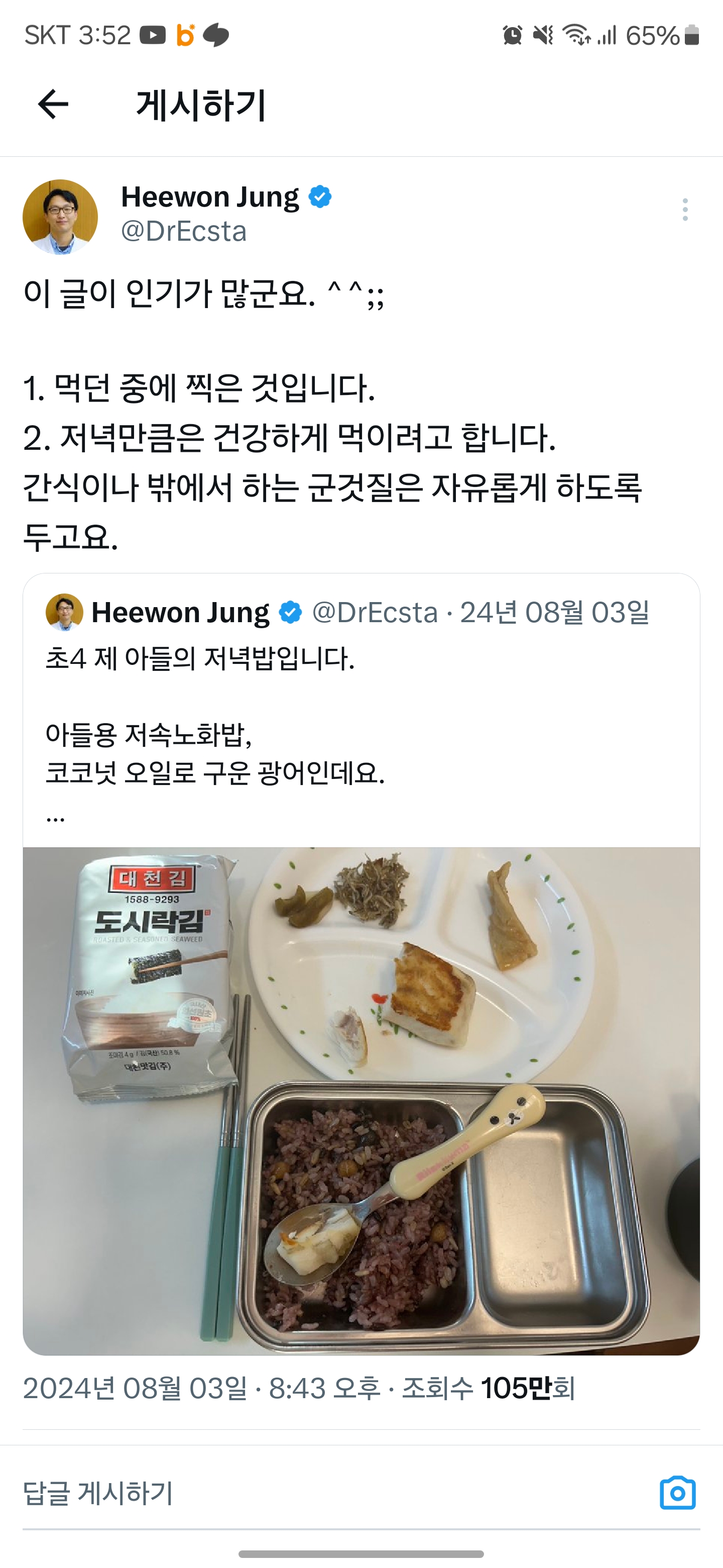 한끼는 건강하게 먹이는거면 뭐... 점심은 학교에서 줄 테고 | 25.03.08 16:49 | | |