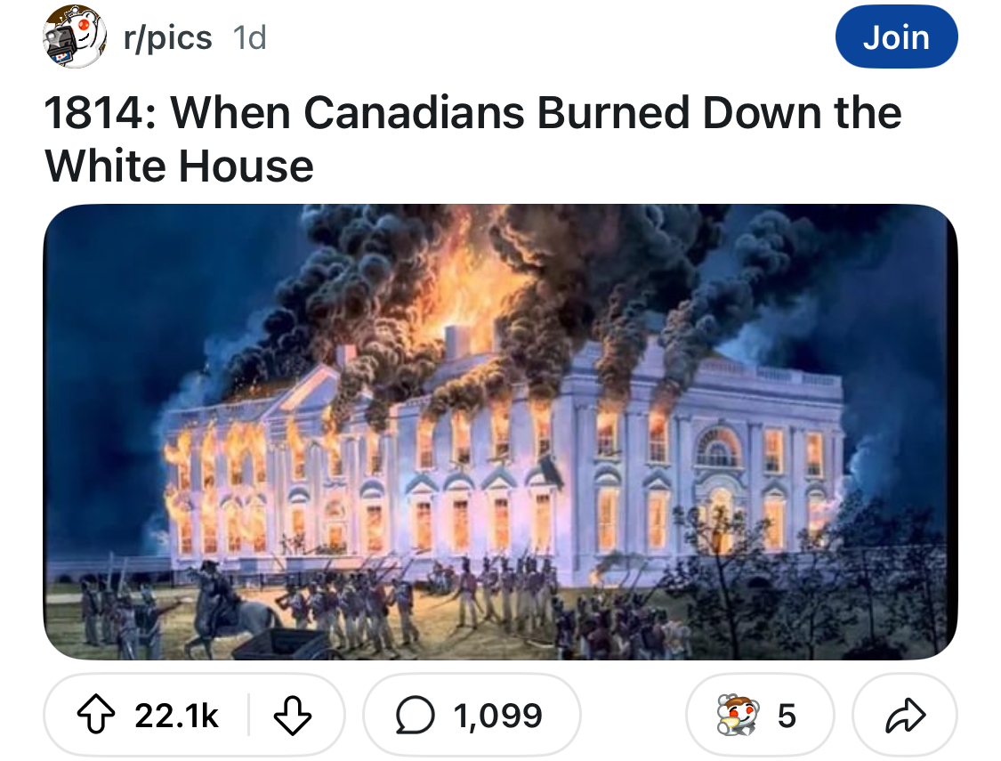 전쟁 자체는 1812년부터 1815년까지였는데 백악관을 불태운 건 나폴레옹을 앨바 섬으로 보내버린 후의 일인 듯 본국에서 레드코트를 파견할 여유가 생겼으니까 그래도 훨씬 긴 시간동안 영국령 북아메리카 식민지인들이 알아서 막고 있었으니 충분히 자랑스러워할 만함 | 25.03.08 19:17 | | |