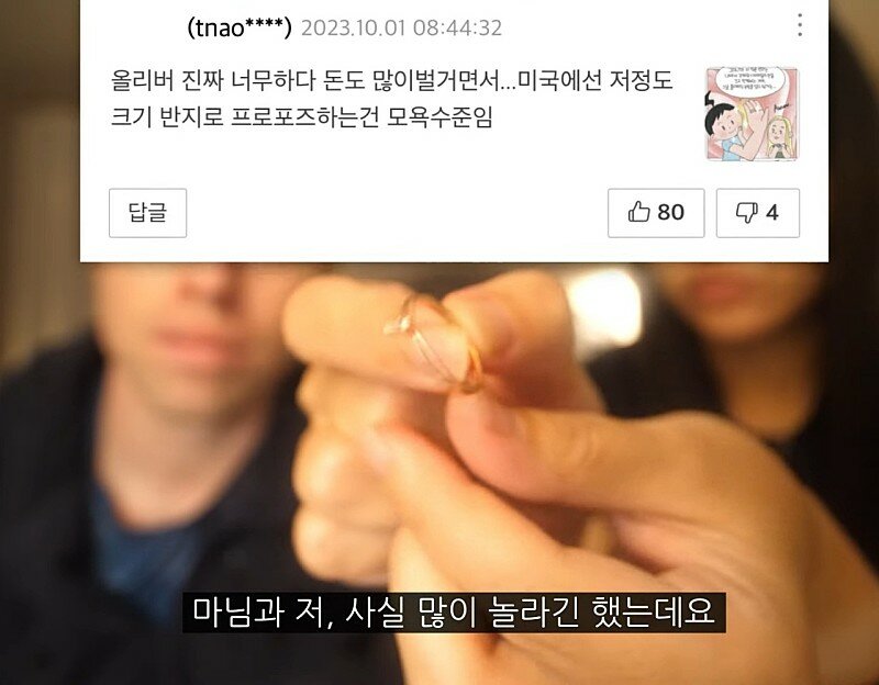 여초 측에서도 반지 작다고 올리버쌤을 욕했고.. 성별을 가리지 않고 공격하는 사람들이 많았지