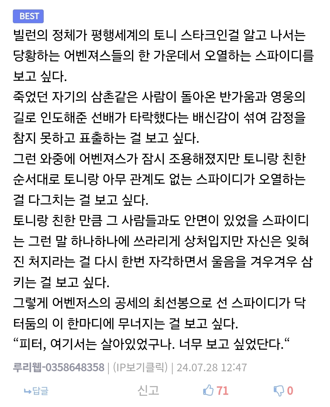 스파이더맨의 정체를 어벤져스의 그 누구도 모르지만 그는 안다 | 25.03.09 00:14 | | |
