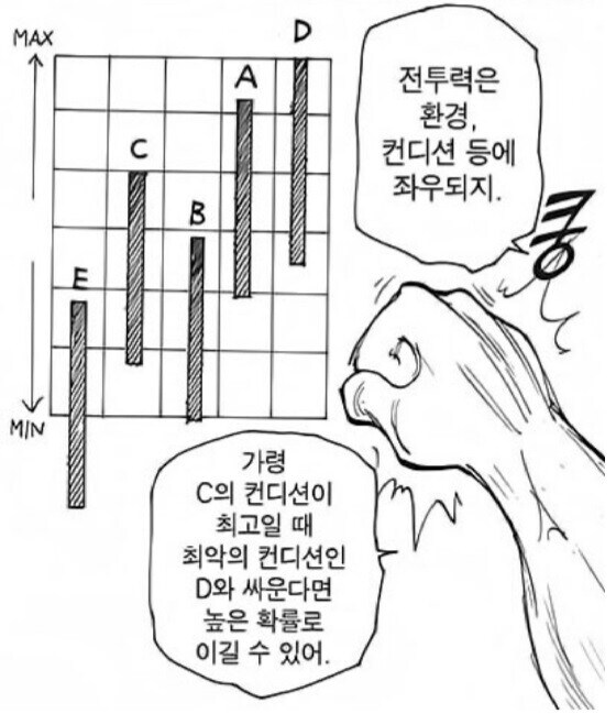 비스케가 평균적으로 더 강한 사람이 로우컨디션일때하고 평균적으로 더 약한 사람이 최고 컨디션일때 붙으면 모르는 법이랬나 그런 이야기도 했던거같은데