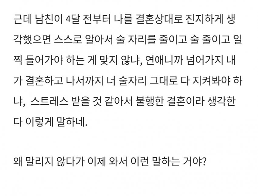 찾아봤는데 따로 에피소드가 있는건 아니고 진지하게 결혼 생각했으면 알아서 술자리 줄여야지 결혼하서도 그 꼬라지 보긴 싫다 정도 | 25.03.10 10:16 | | |