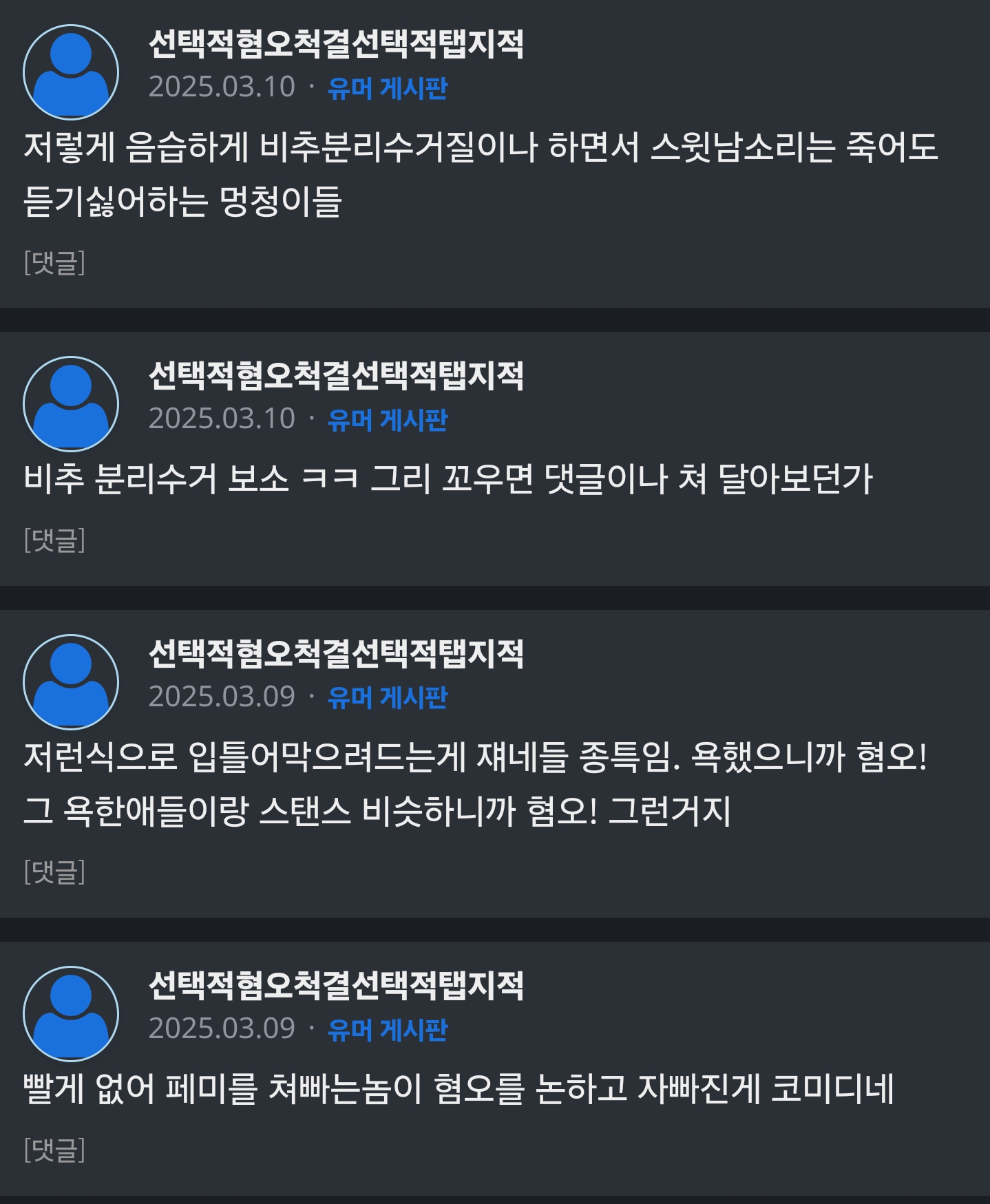 지금 내가 보는 시점 기준 20개임 그전부터 욕먹고 있는걸텐데 늘어난걸테니 버러지가 어지간히 많긴 한듯 | 25.03.11 09:39 | | |