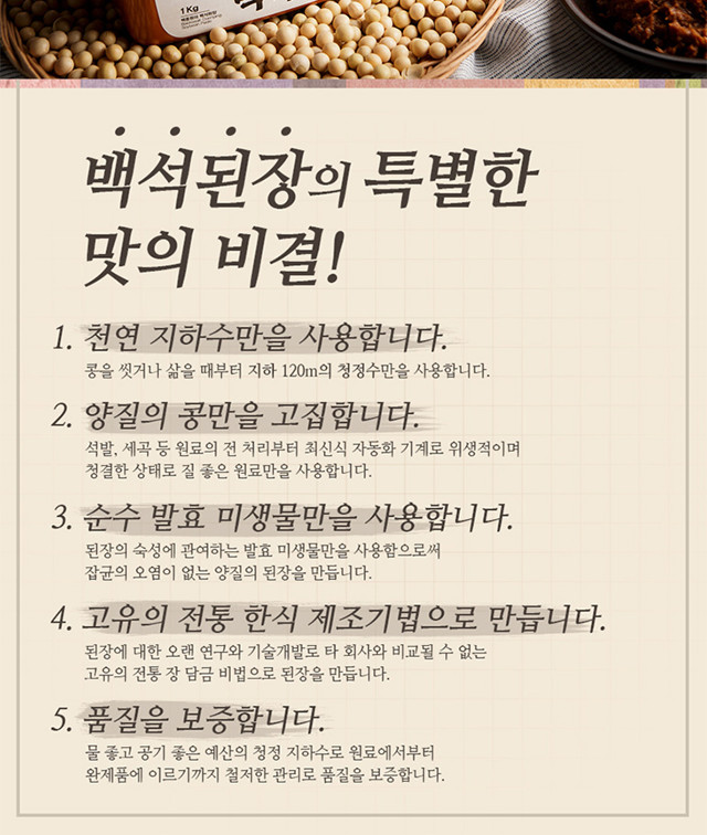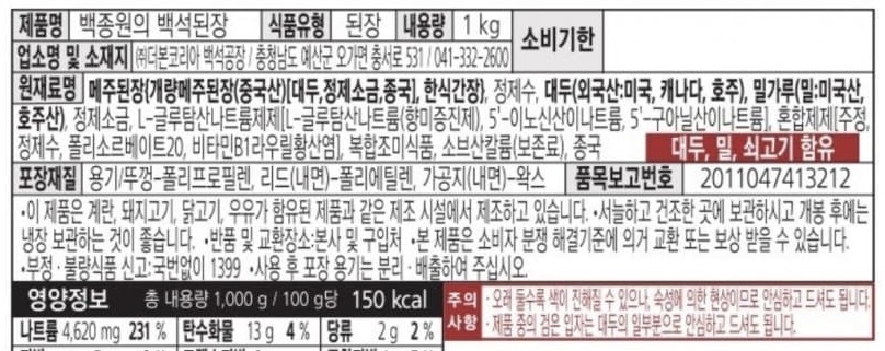 광고문구는 뭐 전통된장인것처럼 썼는데 주 재료는 중국산 매주, 추가로 들어간 콩은 미국 캐나다 호주산 ㅎ 광고문구도 교묘하게 국산을 썼다거나 그런말은 없음 ㅎㅎ