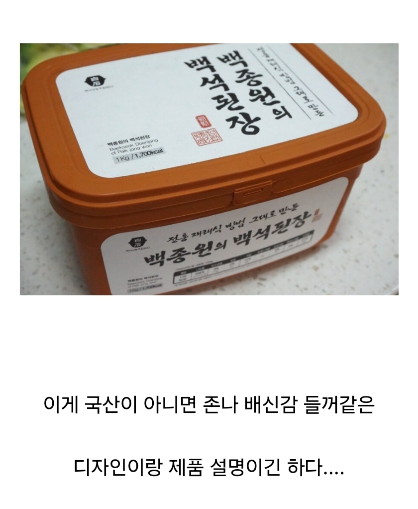농지법 위반으로 고소당하면서 백종원 된장 이야기 말나옴 -> 백종원 재래식 된장이라고 팔아왔는데 콩이 수입콩이라고? -> 백종원 재래식 된장만 그런게 아니라 다른 재래식 된장들도 수입콩 쓴다 -> 그러면 업계전체가 문제임? -> 같은 브랜드라도 순수 국산콩만 쓰면 별도로 분리해서 판매함 | 25.03.11 12:31 | | |