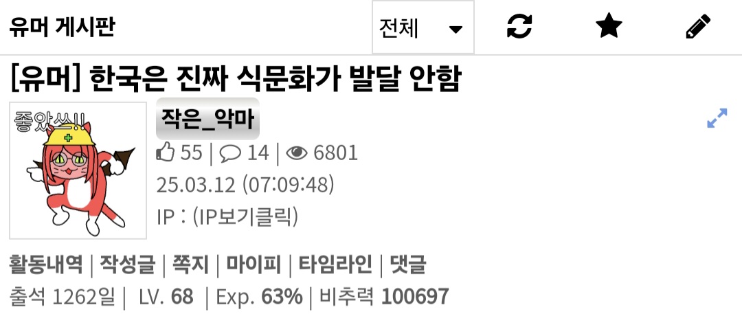 그렇게 맛있는 음식을 찾아 지구를 돌아다녔더니 어느덧 해가 지지않는 나라(과거형)이 되었다는... | 25.03.12 07:21 | | |