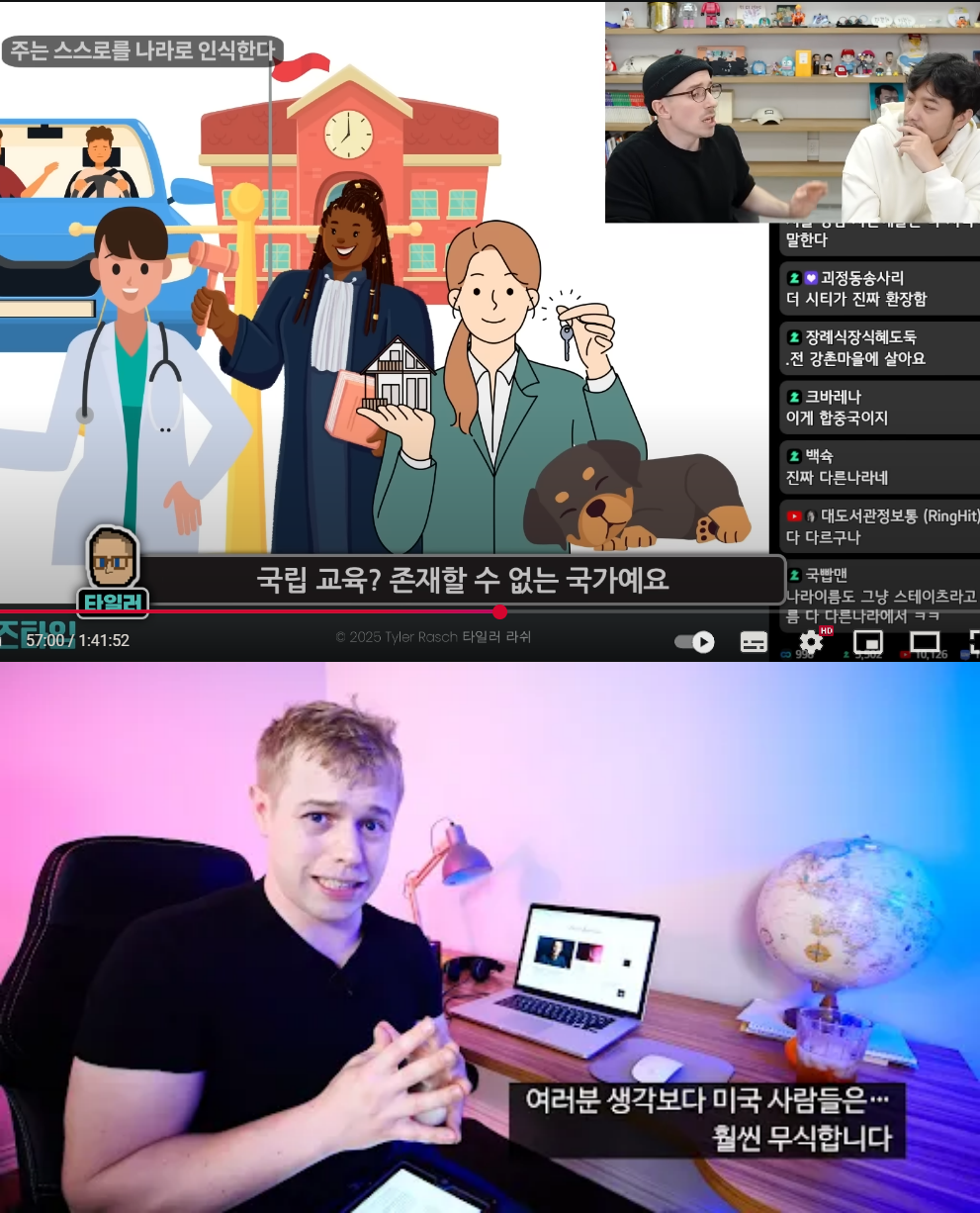 https://youtu.be/x7bn9r5mF_Q?si=8nU8PGg2CyYpt_-b&t=3420 얼마전 타일러 출현한 방송에서 미국은 주마다 법이 달라서 주들이 다른 국가라고 보면되고 그로인해 국가 의무 교육이라는게 존재할 수 없고 그걸 하면 오히려 불법(위헌)이라는 사실을 듣고 충격먹음.. 왜 올리버샘님이 미국사람들이 생각보다 무식하다고 하는지 알겠더라... 의무교육이 불법이라니....