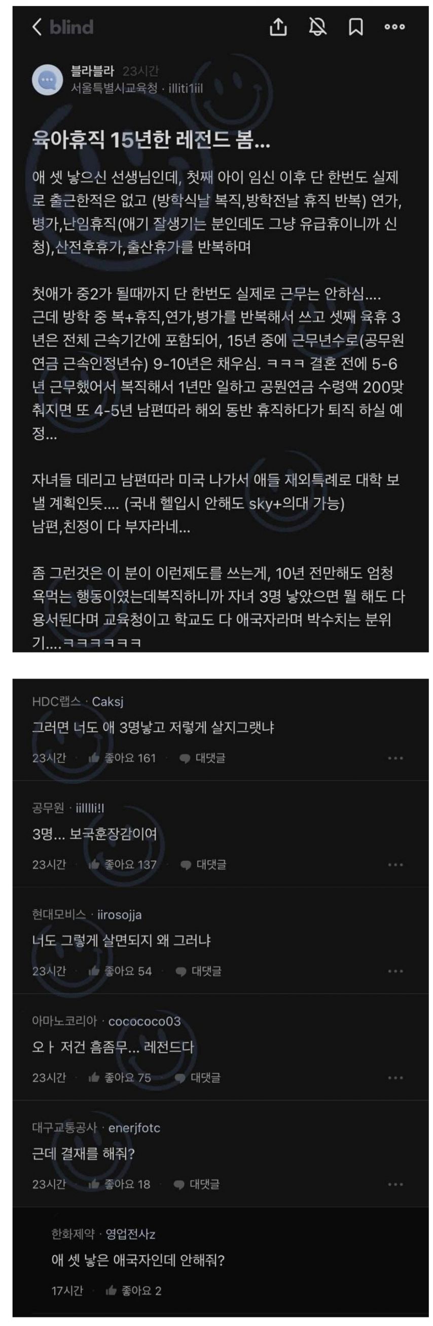 주작같긴 한데.. 요즘은 도덕성보다는 합리성이 더 중요한 시대되서 이런 글에도 부정적인 글들은 많이 안생기기는 하는듯.. 같은학교 공무원들이 본인들이 아니라서 공감대가 형성안되는 것도 있는거 같고..