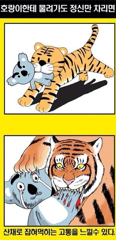호랑이를 만났을 때는 몸집을 크게 위협적으로 고개를 세우면서 양손을 팔벌려고 서 있어야. 고통없이 먹힙니다.