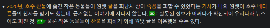 웜뱃 : 호주에 산불이 크게 났을때 땅을 파서 많은 동물들을 자신의 땅굴로 피신시켜주게함. 놀랍게도 포식자의 관계의 동물들도 많이 섞여서 들어왔지만 다들 가만히 산불이 끝나길 기다렸다고... 호주에서 영웅 동물로 칭송 받음 | 25.03.14 04:12 | | |