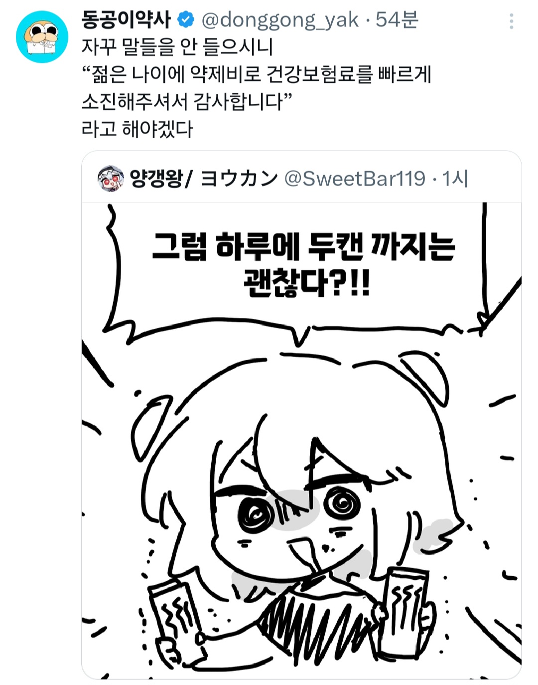 약사님 약사님 이거 핫식스에 사이다랑 박카스 탄건데 두캔 아니니까 괜찮죠? | 25.03.13 17:33 | | |