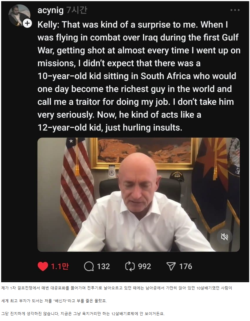 치킨호크 일론 머스크: 그렇게 화성 타령을 해대지만 성층권 구경 조차 한 적 없음. 마크 켈리: 우주 임무만 4회 수행한 우주인이면서 참전용사.