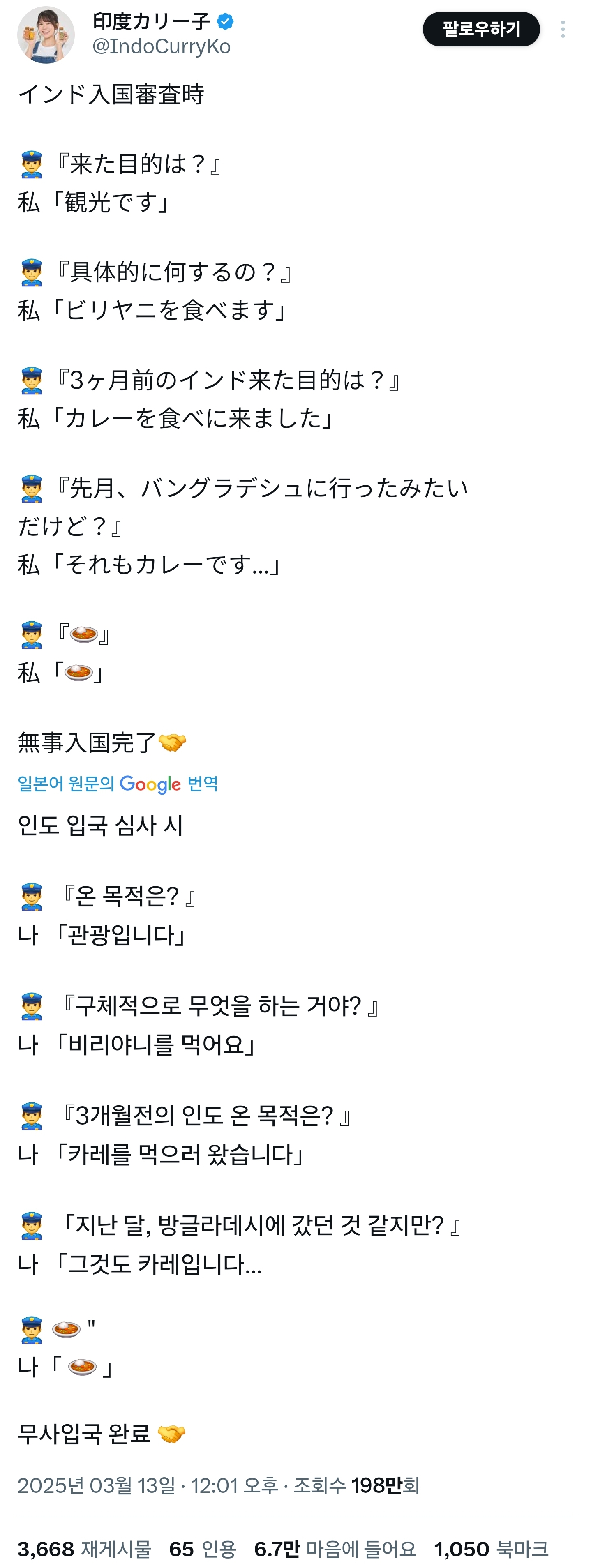그래서 나도 일본갈때마다 입국심사때 밥먹으러왔다고 함 심사원이 가끔 빵터지긴하는데 훨씬 빨리 OK받는듯 | 25.03.14 13:58 | | |