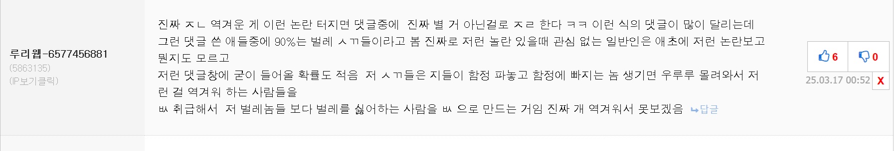 내가 방금 쓴 댓글인데 수정할 필요없이 그대로 또 가져오면 되겠다 역겹다 진짜