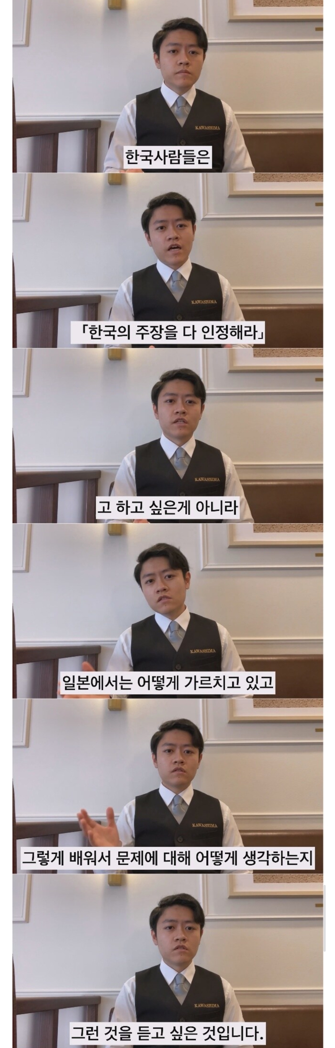 한 쪽 역사만 배우면 토론을 할 수 없다 한국 사람들은 '한국의 의견에 맹목해라'라고 주장하는 것이 아니라 왜 너희가 생각하는 것이 틀렸는지, 그것이 어떻게 문제를 일으키는지를 논의하고 싶은 것이다 미묘한 차이라면 미묘한 차이지만 결정적인 차이가 있고 그 차이는 매우 중요하다 사고에 근거가 있는가? 하는 차이
