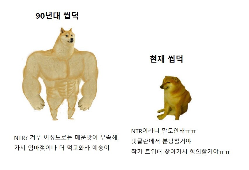 NTR물 좋아할 수 있고 그거에 내성도 높을 순 있는데.. 다 자기들 같지 않다는 건 생각을 안 해주더라.... 불호의 영역인게 확실한데 꼭 지들이 극혐하는 PC주의자 처럼 너네가 내성을 더 길러야돼 이 모자란것들아 이런 스탠스로 댓글 다는 꼴을 보자니 갑자기 열 받네