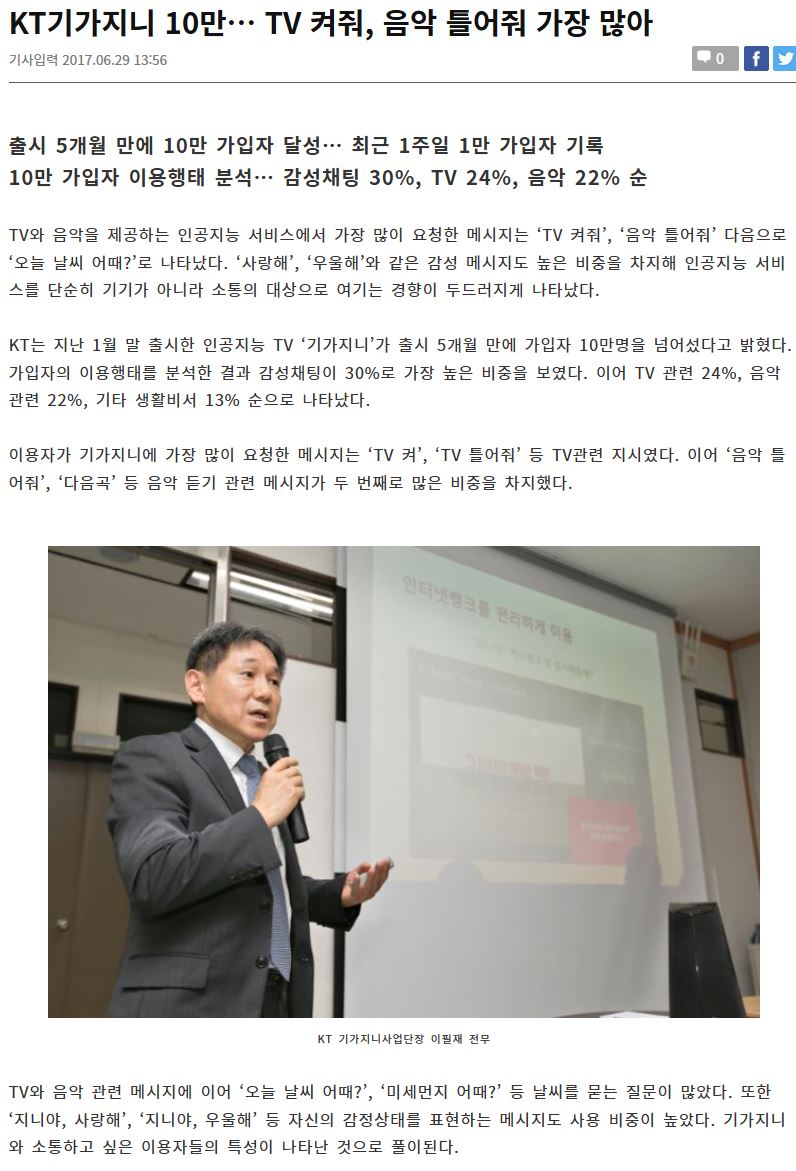 2017년까진 티비틀어줘나 날씨 등의 실용성이 제일 많았다는데 그때조차도 티비or음악 재생,날씨 다음으로 감정을 표현했다고하니 시대가 각박해지고 사람과 사람사이 서로 감정을 표현하는게 적어지니 ai에게 내뱉게 되는게 아닐까 생각되네요 +사랑해가 많은건 어쩌면 시리에게 사랑해 듣기같은걸 기가지니에 실험한걸수도?ㅋ | 25.03.18 00:04 | | |