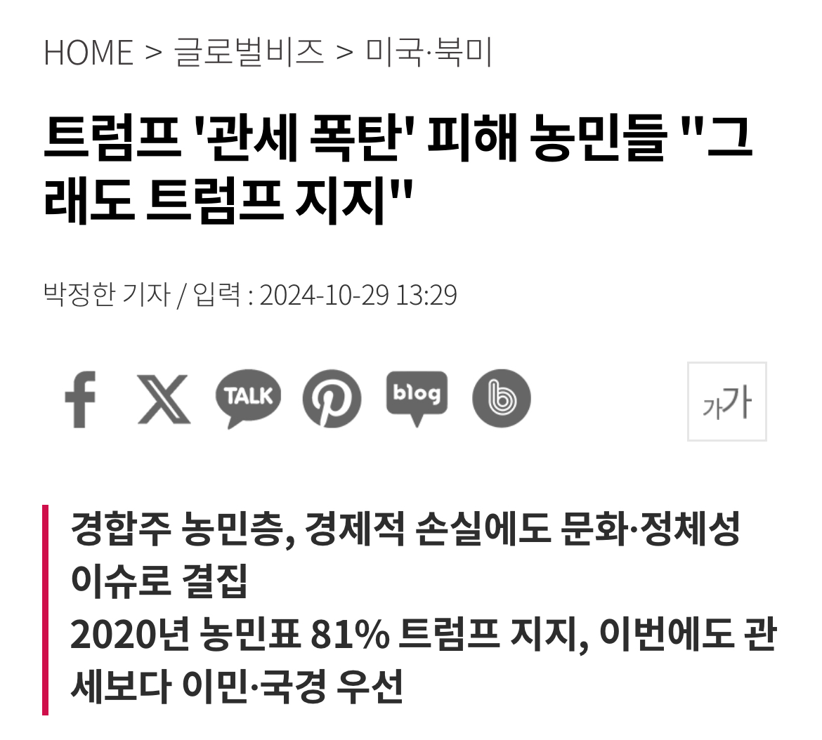 https://m.g-enews.com/view.php?ud=202410290733293061fbbec65dfb_1 저거 모르고 뽑았는데 당했다가 아님 알고도 뽑은거임 당장 트럼프1기때도 관세정책으로 농민들 손해 엄청 봤는데 몰랐을리가 미국 농부들은 말이 농부지 대부분 대토지 가진 기업형 농부들임 우리나라 농부 생각하면 안됨 걔네들이 트럼프를 지지하는 거임 자기들 손해보다 이민자들 문제를 해결하고 중국 견제를 하는게 더 중요하다 본거임 우리나라로 치면 외노자들 고용해서 중국 수출하는 공장 운영하는 사장들이 국가를 위해서는 우리가 손해를 감수 하겠다 외노자 고용을 줄이고 중국 견제를 지지한다 이런행동을 하는거임 무식해서 몰라서 트럼프 지지하는게 아님 그러니까 ㅈ럼프와 ㅈ럼프주의자들 새끼들이 미국을 차지하고 있는거임 정확한 상황과 지지 심리를 분석해야 대처가 되지