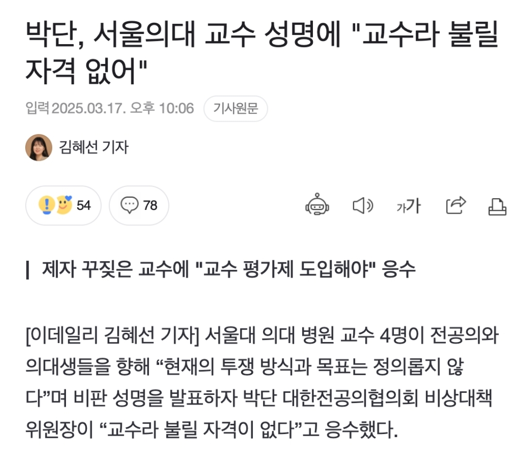 서울대 의대 교수들도 성명 냈더라. 오만하기 그지없는 행위, 환자들만 피해보는 행위라고