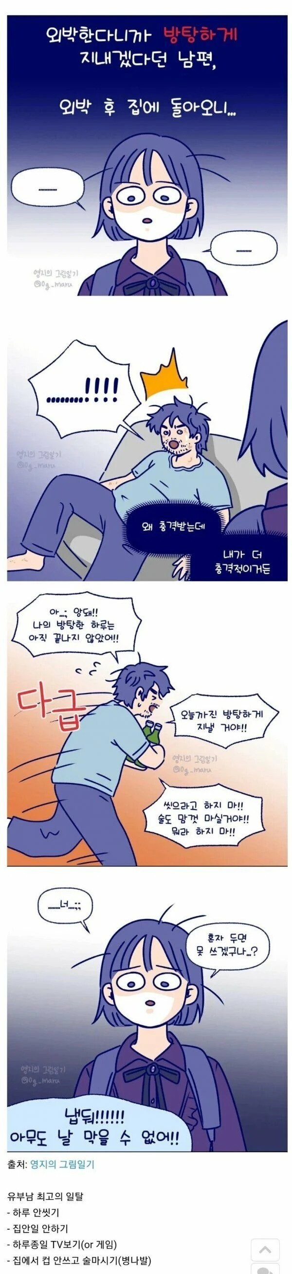 나도 왠지 이거 같다. 못버틸 정도로 피곤한게 아니면 반드시 자기만의 여가 시간이 하루에 1시간이라도 있어야 되는 사람이 있는데 저 글 남편이 그런 사람인듯. 저집에 애가 있는지 모르겠지만 어쨌든 야근이나 출퇴근 거리, 집안일, 와이프 이야기 들어주기 기타 등등 할거 다 하면 밤이 늦어서 수면시간을 줄여서라도 자기 시간을 갖고 있는 거겠지 | 25.03.18 14:10 | | |