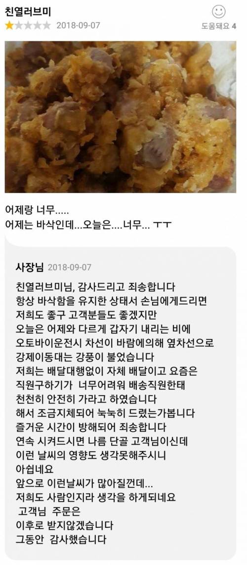 악천후로 인한 배달 지연으로 덜 바삭하다고 별점 1개 갈기면은 사장입장에서는 머리에 힘줄 올라오지
