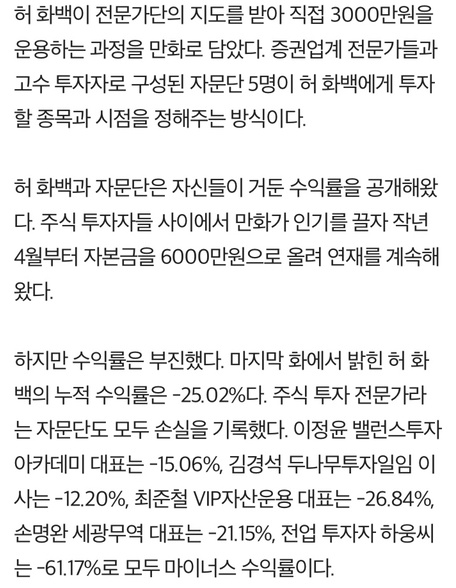 저거 팩트는 저 전문가들이 자기 계좌로는 수억씩 수익 보면서 허영만 화백 계좌로는 그냥 막 해서 작살냈더라..ㅋㅋㅋㅋ