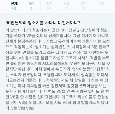 v8 이면 다이슨인가? 다이슨 좋다고 해서 나도 v8 샀는데 솔직히 무선이라 편하다는 정도 밖에... 성능은 기존 유선 lg동그리 청소기가 더 좋음. | 25.03.20 12:49 | | |