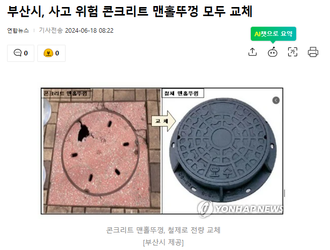 길거리에서 흔히 보이는 이 콘크리트 맨홀도 엄청 어ㅟ험한 저 원판 안에 지지대가 될 철골 구조가 없어서 노후화된건 이제 슬슬 부숴질 시기가 되었다고 하더라